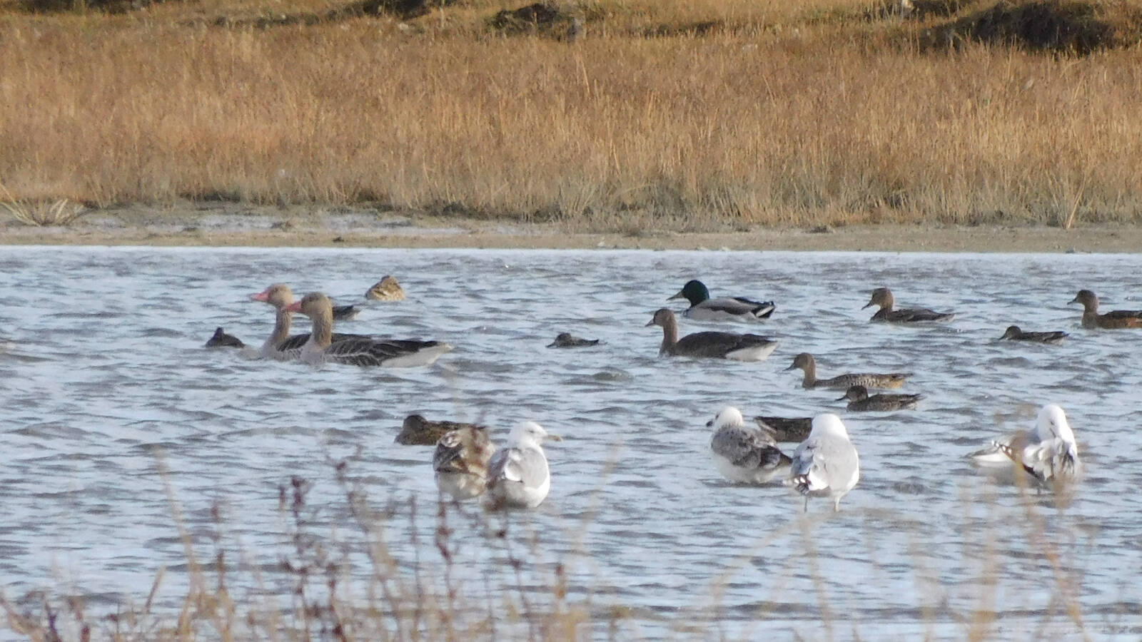2023-12-31. Michael:How come its identified as GWfG? 2024-01-02. Jérémie Berlioux: Slightly smaller than the two greylag on the photo. But larger than a LWfG. The feathers around the base of the bill are dark brown and clearly contrasting with the rest of the head-sides, which are paler. Bean Goose and Greylag juv don't have this contrasted head. 2024-01-09. Michael: Indeed, a juvenile. Thanks.