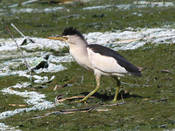 Небольшая птица с обликом выпи или маленькой коротконогой цапли с черной или темной спиной. Самки отличаются от самцов отсутствием черного, те же участки оперения окрашены коричневым, есть пестрый рисунок на спине. Молодые похожи на самку, отличаются от нее большим количеством пестрин, особенно заметных на кроющих крыла. Вес 100-150 г, длина 33-38, крыло 14.2-15.7, размах 53-58 см.