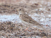 Похож на малого и, особенно, серого жаворонков, отличается более однотонной и светлой окраской, с преобладанием глинистых и пепельно-серых тонов. Общий фон верхней стороны беловато-серый, со светло-буроватыми наствольными пестринами. Сверху на голове эти пестрины узкие, на спине широкие. Весь низ серовато-белый, с узкими, слабо заметными продольными пестринами на груди и боках. Над глазом широкая беловатая бровь. Спереди и снизу глаз окружен серовато-белыми перьями. Кроющие уха светло-буроватые. От малого жаворонка отличается отсутствием темных пятен по бокам зоба, более короткими третьестепенными маховыми. Наиболее надежное отличие от серого жаворонка – формула крыла (оно более короткое и округлое) и вокализация. Вес 25-30 г, длина 16-18, размах 30 см.