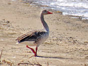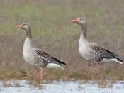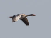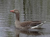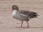 Крупный гусь размером немного меньше домашнего. Отличается от гуменника и белолобого гуся светлой серой окраской. Особенно заметен, даже на большом расстоянии, серебристо-серый цвет верха крыльев (кроющие). Кроме того, от гуменника отличается светлыми головой и шеей (не темнее туловища), розовым цветом клюва и ног, от белолобого гуся - отсутствием большого белого пятна на лбу (бывает маленькая белая полоска поперек лба у самого клюва), розовыми ногами, на брюхе не бывает больших черных пятен, могут быть только мелкие темные пестрины. Молодые отличаются от взрослых более монотонной окраской - менее выражены светлые полосы на крыле и боках, образованные краевыми каемками на перьях, брюхо темнее, чем у взрослых, совсем без темных отметин. Отдельные пятнышки на брюхе появляются только на третьем году, окончательный взрослый наряд приобретают на 4-й год жизни. Вес 2.1-4.5 кг, длина 75-90, крыло самцов 43.5-51.3, самок - 39.5-47.0, размах 147-180 см.