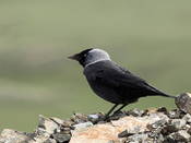 Common, in places abundant, resident or short distant migrant. Inhabits the deciduous and riparian forests in valleys, the pine and birch groves, clay precipices, cliffs and the villages and towns on plains and in mountains at altitudes to 1500-2500 m. During the migration and wintering occurs on the stubble fields, meadows, hayfields, around the cattle farms and rubbish dumps. Spring migration begins in mid – end February, most birds arrives in March, the last birds recorded in early April. Migrates in flocks of several hundreds or thousands birds. Breeds in loose colonies of two-five dozen, rare by single pair. Nest is located in tree holes, nesting boxes, hole in clay precipice (burrowed by both partners), in old Rook nests, in witch-brooms, in crevice of rock, masonry or monument. Nest is built from the twigs and dry grass and is lined with hair, rags, scraps of paper and feathers. Both partners repair the old nest or build new one for 2-24 days. Clutch of 2-8, usually 4-6 eggs, is laid in mid April – second half of May. Only female incubates for 13-16 days, male brings the food to female. Both parents feed juveniles, which fledge at age 30-33 days old, in late May – late June. Autumn movement begins in July, often in mixed flocks together with Rooks. True migration begins in the end of September. Most birds departed in October, odd birds linger to late October – early November. In winter occurs with other corvids often around towns and villages.
