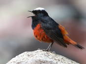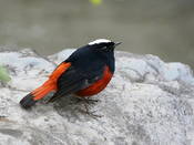 Белошапочная горихвостка - птица яркой окраски. Общий тон окраски - черный с металлическим блеском, который, впрочем, на расстоянии не сильно заметен. Живот, задняя часть спины, надхвостье, большая часть хвоста яркого кипично-красного цвета. По краю хвоста проходит широкая черная полоса. На голове белая шапочка. Резко выраженного полового диморфизма в окраске белошапочной горихвостки нет, но при тщательном изучении окраски, особенно в период размножения, можно заметить разницу между самцами и самками. Белая шапочка у самцов немного больше, чем у самок. Особенно сильный металлический блеск перьев груди, шеи и зоба наблюдается только у самцов, эти перья у самок несколько тусклее. Сама птица размером с краснобрюхую и красноспинную горихвосток; но при посадке часто приподнимает и опускает хвост, как это делают соловьи (черногрудая красношейка, варакушка). Эта особенность белошапочной горихвостки является присущим только ей признаком среди горихвосток. Пение наблюдается только в брачный период жизни. В отличие от других сородичей белошапочная горихвостка приурочена исключительно к быстротекущим горным рекам и их притокам; зимой и летом от рек далеко не отлетает.