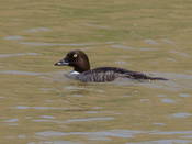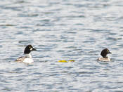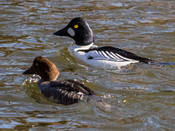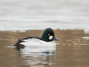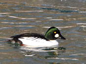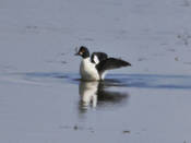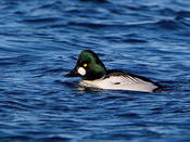 Коренастая утка средней величины. Весенний самец имеет контрастную окраску из сочетаний белого и черного. Основные элементы для опознавания - широкое белое зеркало на второстепенных маховых, сильно расширенное почти до переднего края крыла; большая круглая, черная, с зеленым блеском, голова, на щеке между клювом и глазом округлое белое пятно. У самки оперение в основном серое, на крыле тоже белое зеркало и еще две параллельных ему белых полосы на кроющих крыла; голова коричневая, четкий белый ошейник. Клюв у самца черный, у самки - серый, с желтой предвершинной полосой. У самца и самки лапы оранжево-желтые, с черными перепонками. Глаза желтые, у самки более бледные, до белого. Самка в летнем пере окрашена как весной, но без белого ошейника. Самец в летнем пере похож на самку, но голова темно-бурая, рисунок крыла такой же, как весной, клюв черный, без желтой полоски. Осенью у самцов снова сменяются контурные перья на брачный наряд, так что к отлету они выглядят более или менее по-весеннему. У годовалых самцов весной белые перья впереди зеркала не образуют сплошного белого поля с зеркалом, а обычно имеют вид грязноватой полоски, отделенной черной полосой от зеркала; голова без отлива, пятно на щеке и белые бока с бурыми "помарками". Молодые похожи на летнюю самку, но клюв серый, бывает с неяркой желтоватой перевязью, глаза грязно-желтые или буроватые, есть белое зеркало, но на кроющих крыла только один ряд белых перьев, т.е. белого меньше, чем у взрослой самки; молодые самцы уже заметно крупнее и головастее самок, с большей площадью белого на крыле. Снизу летящего гоголя во всех нарядах можно отличить от других уток по черному подбою крыльев с белым зеркалом. Вес самцов 900-1100, самок - 600-850 г, длина 42-50, крыло самцов 20,2-23,1, самок - 18,6-20,7, размах 65-80 см.