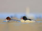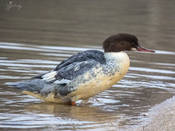 Крупный крохаль, размером почти с гуся. Тем не менее, его легко спутать с длинноносым крохалем. Самец отличается от длинноносого крохаля отсутствием хохла (в полете признак "не работает"), однотонно-белым, с розовым налетом, цветом боков и низа тела от шеи до хвоста, без темной перевязи в области зоба (розовый налет может быть выражен по-разному, вплоть до его полного отсутствия); сверху на крыле одно сплошное белое пятно, занимающее большую часть крыла; черной продольной полосы по верху шеи нет, ноги ярко-красные, глаза черные. Самку следует отличать от самки длинноносого крохаля по наличию на передней стороне шеи резкой границы рыжего (от головы) и белого (от груди); сверху на крыле одно большое белое пятно, и лишь слегка намечен раздел в виде короткой темной полоски; спина пепельно-серая, ноги оранжево-красные, глаза бурые. Осенний самец окрашен как самка, отличается от нее большего размера белым полем на крыле (как весной), темной спиной, голова светлее, чем у самки, хохол меньше, между клювом и глазом есть светлая полоска. Молодые похожи на самку, но с более коротким хохлом, верх головы с темными штрихами, белое пятно на горле и подбородке нечеткое, лапы грязно-желтые. Годовалые самцы отличаются от старых тем, что имеют "грязь" на кроющих крыла и на нижней стороне тела, красный цвет клюва и ног тоже с бурыми и желтыми "помарками". Вес 1100-1800 г, длина 58-66, крыло самцов 26.3-29.5, самок - 24.2-27.0, размах 82-97 см.