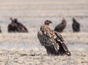 У взрослых, достигших половозрелости, голова и шея покрыты белым пухом, верх светлый палевый, причем края перьев несколько темнее, надхвостье белое, с охристым налетом, воротник из коричневатых заостренных и рассученных перьев со светлыми наствольями, весь низ белесый, подкрылья белые, пятно на зобе бледно-бурое, рулевые, маховые, большие кроющие крыла темно-бурые. Клюв роговой, с желтизной, радужина буроватая, ноги серые, когти черные. Молодые темнее, буровато-коричневые, в светлых охристых наствольных пятнах, голова и шея покрыты буроватым пухом, маховые и рулевые черные, подкрылья желтоватые, восковица бледно-бурая. Этот первый гнездовой наряд сменяется в ходе постепенных годичных линек в промежуточные более светлые. Размеры: крыло 765-849 мм, хвост 320-410 мм, размах крыльев около 3 м. Вес: 8-10 кг.