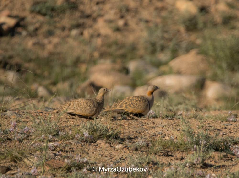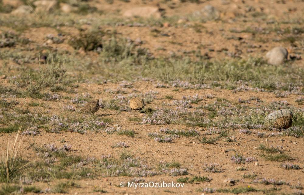 Проснулся рано утром в 5:00 и поехал в сторону предгорья в маленькое водохранилище. Увлекся с парой плавающих уток с маленькими птенцами (огарь). Долго я возился с ними, они близко не подпускали меня к своим птенцам и держали их в дали, а одна из уток (не знаю самец или самка) отвлекала меня прилетая близко и подражая раненного стараясь отвлечь меня. В общем решил не беспокоит их и на машине умчался ближе к горам, к открытым просторам у предгорья. Вдруг из далека вижу на земле двигаются какие-то контуры в кучке где-то 30 силуэтов. Время было где-то 7 утра. С восхода солнца виделись их контуры похожие на кекликов. Я был уверен, что я вижу кекликов. Решил близко подъехать и увидел, как они быстро поднялись и улетели вверх за холмики не как кеклики. Я продолжал приближаться к подножью холма и остановился, заглушил мотор машины и вдруг рядом где-то в 20 метрах взлетает пара таких птиц издающее интересные голоса. К сожалению, не успел фокусироваться и сделать снимок с наиболее близкого расстояние. Быстро настроил камеру и решил разведать окрестность тихо и осторожно пешком. Обошел холмик с левой стороны и увидел около 10 особей из расстояния где-то 100 метров. Сделал несколько снимков, но как только они меня заметили быстро ушли за горизонты.
