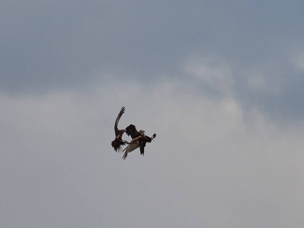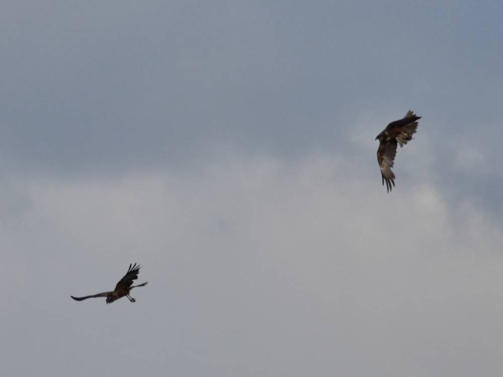 Скорее всего это не бой. Это одна из особенностей поведения луней. Самец ловит добычу, прилетает к гнезду и приглашает самку пообедать. Самка взлетает к своему любимому и в воздухе происходит передача добычи. Таким образом папа-лунь заботится о своей семье.
