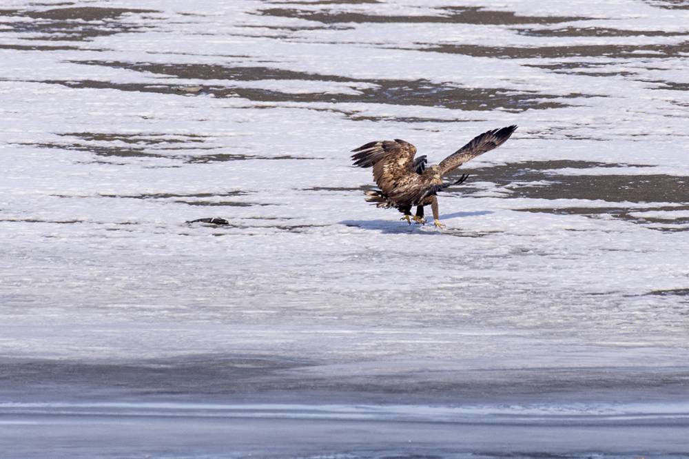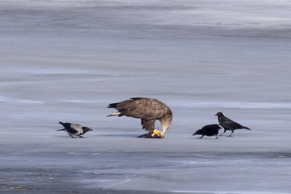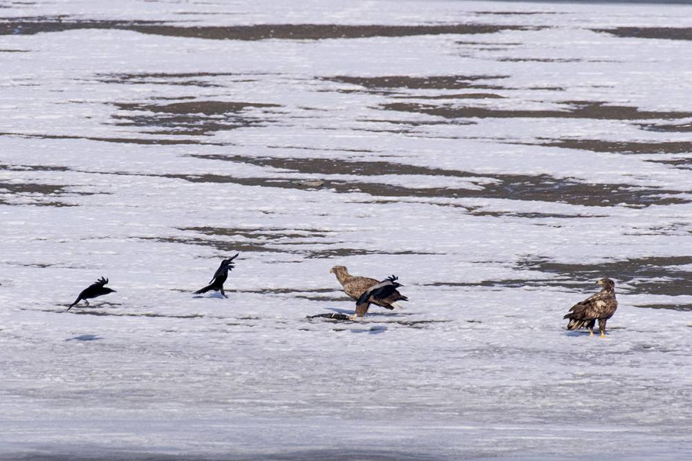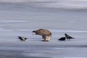 Пятнадцатого января на прудах в с. Озёрное (близ Бишкека) наблюдали картину, как две вороны пытались окружить орлана и урвать у него кусочек рыбки. Но у них ничего не получилось. Слишком мало сил, чтобы одолеть такого грозного хищника. [...... read more ]
