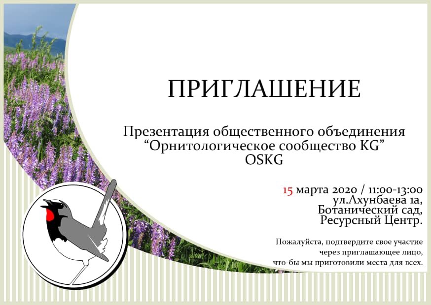 Приглашаю всех желающих и заинтересованных лиц на презентацию новой общественной организации Орнитологическое объединение KG . Главная задача общества - изучение птиц, развитие культуры бёрдвотчинга. Презентация общества состоится 15 марта в Ботаническом саду г. Бишкека с 11.00 по 13.00. [...... read more ]